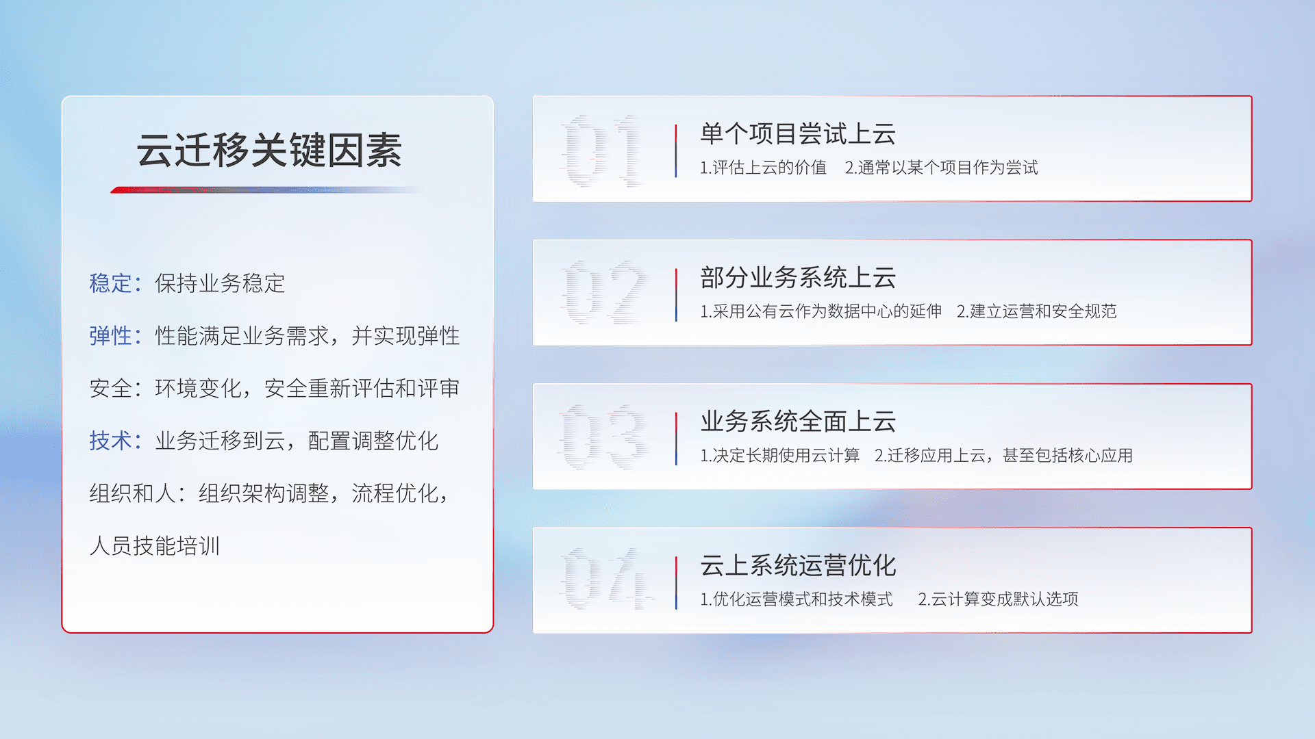 结合实际业务,,从规划设计、、、、云平台选型、、、云原生改造、、、、数据迁移、、、集成交付,,,迁移全过程为客户识别最佳上云路径,,,,做好风险识别管理,,,设计网络架构、、身份权限、、安全审计合规、、、、操作审计、、日志审计、、、、监控告警策略、、多站点容灾设计等,,对云上基础设施进行整体规划,,,提升IT治理水平,,以满足弹性、、、、高可用、、、、高性能的需求。。