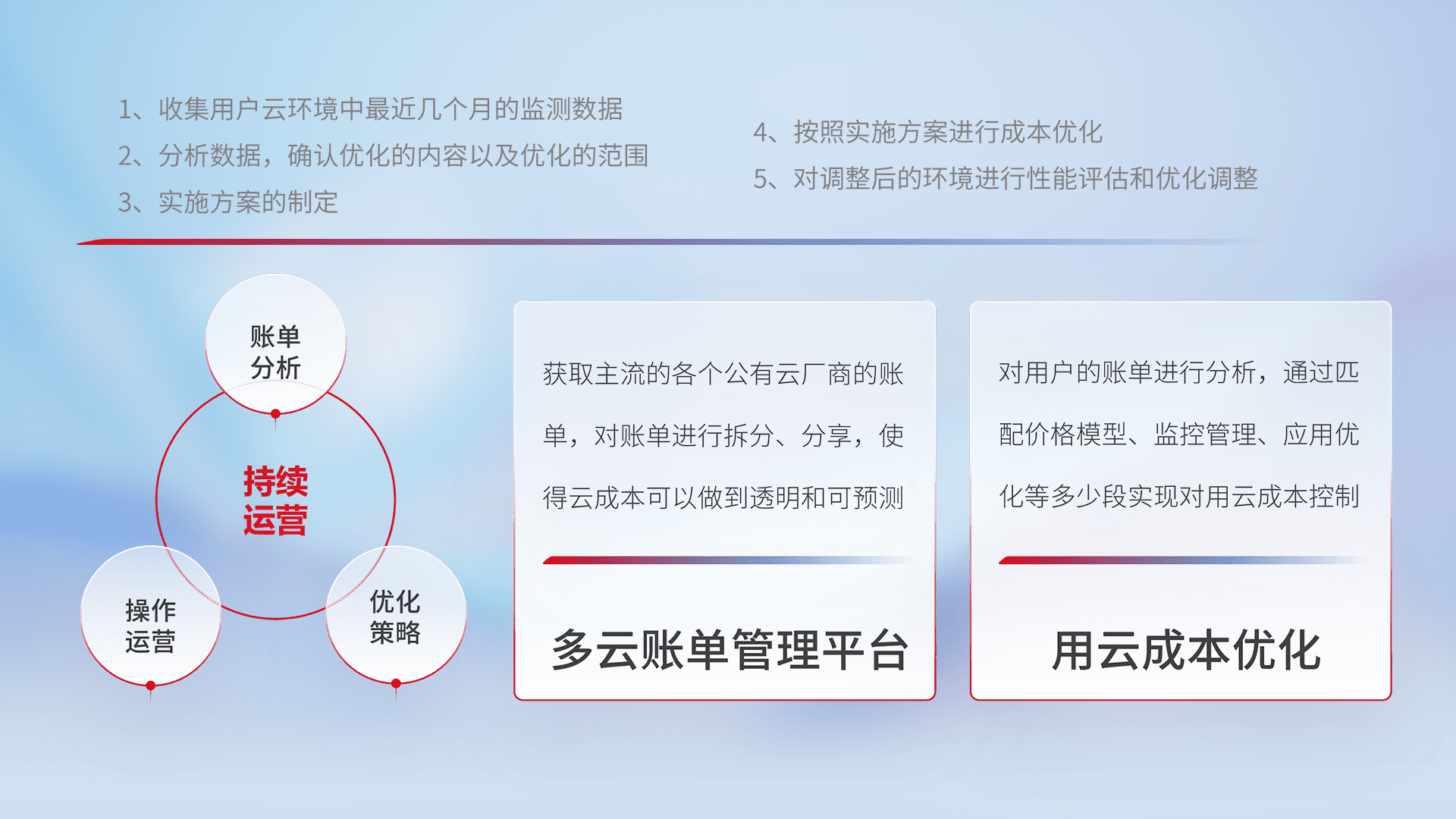 通过多云纳管,,,以统一的资源数据模型把客户的云资源进行抽象和封装,,,,进而实现对多云资源的统一操作,,,,保障云资源管理的可靠性、、、稳定性与可用性。。。。量身定制化运维内容,,,配置、、、、开发运维、、补丁管理、、、备份、、、、监控、、认证和访问管理、、、、审计和日常巡检等,,,保障在用云过程中的可靠度,,,稳定度以及高可用率。。。。